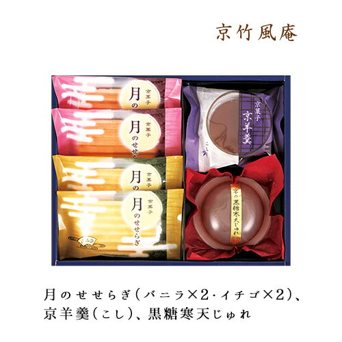 【商品詳細】 名称 和菓子詰め合わせ 商品内容 月のせせらぎ(バニラ×2・イチゴ×2)・京羊羹(こし)・黒糖寒天じゅれ ●アレルゲン:卵・乳・小麦 ●箱サイズ:箱185×225×38mm 賞味期限 製造日から240日※詳しくは商品ラベルに記載 保存方法 直射日光を避け常温で保存してください。